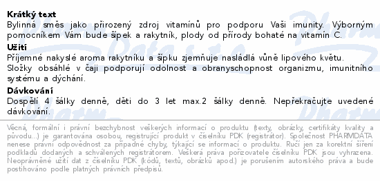 Bylinná směs jako přirozený zdroj vitamínů pro podporu Vaši imunity. Výborným pomocníkem Vám bude šípek a rakytník, plody od přírody bohaté na vitamín C.