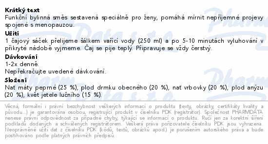 Funkční bylinná směs sestavená speciálně pro ženy, pomáhá mírnit nepříjemné projevy spojené s menopauzou.