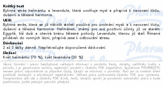 LEROS Levandulové zklidnění je bylinný čaj v nálevových sáčcích, který je určen k podpoře duševního uvolnění, relaxace a tělesné harmonie. Obsahuje pečlivě vybranou směs bylin s hlavním podílem heřmánku pravého a levandule lékařské, známé pro své zklidňující účinky na nervovou soustavu.