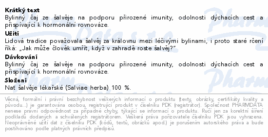 Upozornění: Není určeno pro děti, pro těhotné a kojící ženy. U citlivých osob možnost alergických reakcí. Neužívat dlouhodobě. Nepoužívejte při přecitlivělosti na šalvěj.