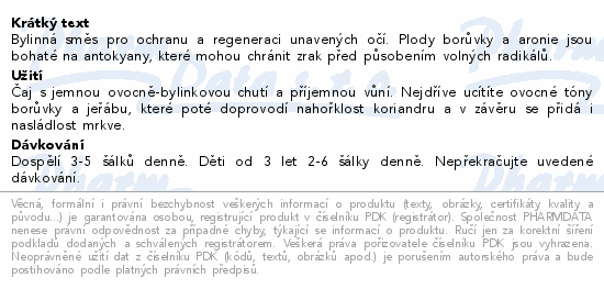 Bylinná směs pro ochranu a regeneraci unavených očí. Plody borůvky a aronie jsou bohaté na antokyany, které mohou chránit zrak před působením volných radikálů.