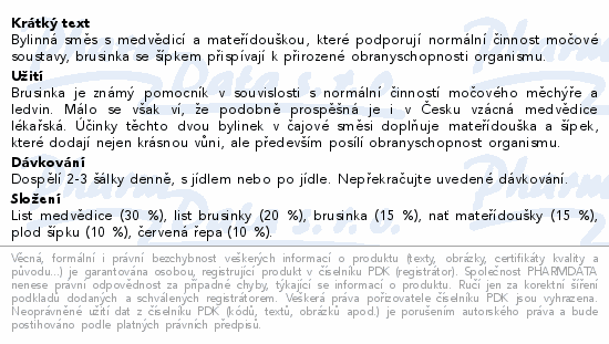 Bylinná směs s medvědicí a mateřídouškou, které podporují normální činnost močové soustavy, brusinka se šípkem přispívají k přirozené obranyschopnosti organismu.