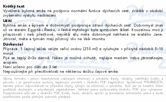 Vyvážená bylinná směs na podporu normální funkce dýchacích cest, zvláště v období zvýšeného výskytu nachlazení.