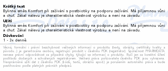 Bylinná směs Komfort při zažívání s postbiotiky na podporu zažívání. Má příjemnou vůni a chuť. Zákal nálevu je charakteristická vlastnost výrobku a není na závadu.