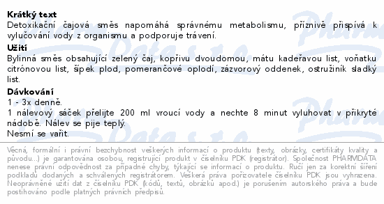 Detoxikační čajová směs napomáhá správnému metabolismu, příznivě přispívá k vylučování vody z organismu a podporuje trávení.