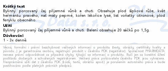 Bylinný porcovaný čaj příjemné vůně a chuti. Obsahuje plod šípkové růže, květ heřmánku pravého, nať máty peprné, kořen lékořice lysé, list voňatky citronové, plod fenyklu obecného.