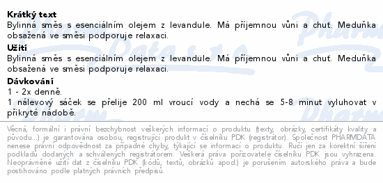 Bylinná směs s esenciálním olejem z levandule. Má příjemnou vůni a chuť. Meduňka obsažená ve směsi podporuje relaxaci.