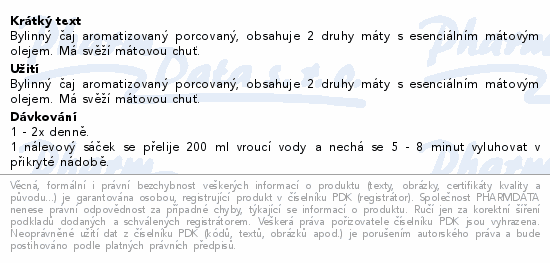 Bylinný čaj aromatizovaný porcovaný, obsahuje 2 druhy máty s esenciálním mátovým olejem. Má svěží mátovou chuť.