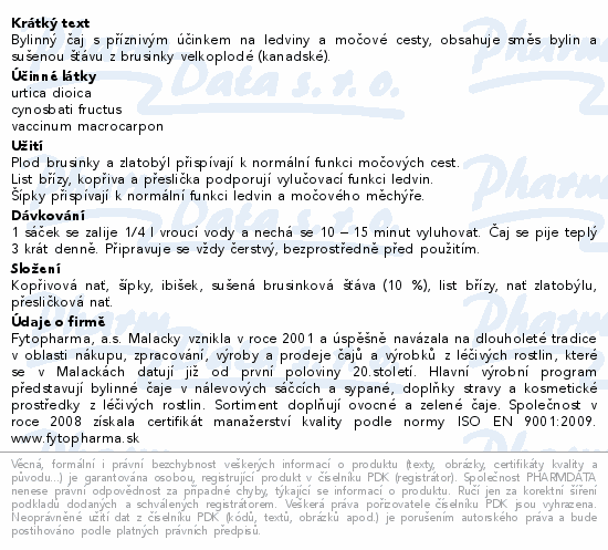 Bylinný čaj s příznivým účinkem na ledviny a močové cesty, obsahuje směs bylin a sušenou šťávu z brusinky velkoplodé (kanadské).