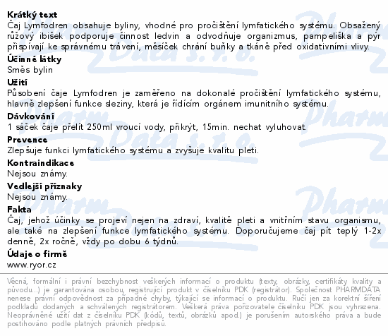 Čaj Lymfodren obsahuje byliny, vhodné pro pročištění lymfatického systému. Obsažený růžový ibišek podporuje činnost ledvin a odvodňuje organizmus, pampeliška a pýr přispívají ke správnému trávení, měsíček chrání buňky a tkáně před oxidativními vlivy.