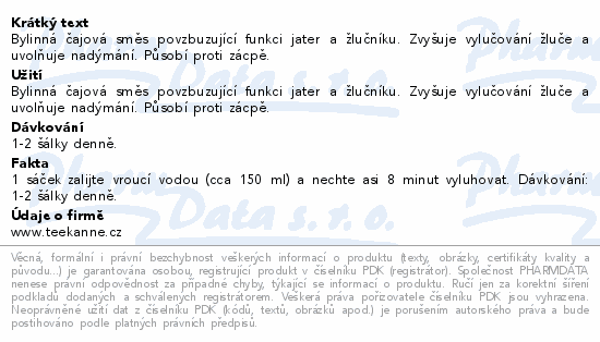 Bylinná čajová směs povzbuzující funkci jater a žlučníku. Zvyšuje vylučování žluče a uvolňuje nadýmání. Působí proti zácpě.