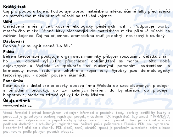 Čaj pro podporu kojení. Podporuje tvorbu mateřského mléka, účinné látky přecházející do mateřského mléka příznivě působí na zažívání kojence.