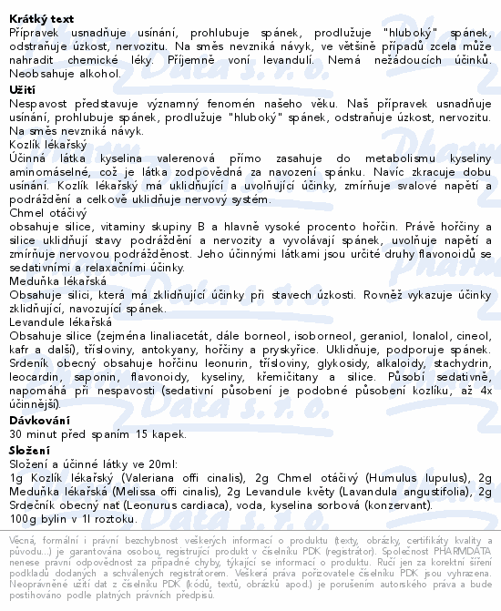 Přípravek usnadňuje usínání, prohlubuje spánek, prodlužuje "hluboký" spánek, odstraňuje úzkost, nervozitu. Na směs nevzniká návyk, ve většině případů zcela může nahradit chemické léky. Příjemně voní levandulí. Nemá nežádoucích účinků. Neobsahuje alkohol.