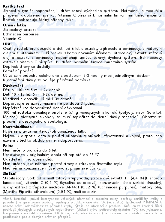 Jitrocel a tymián napomáhají udržet zdraví dýchacího systému. Heřmánek a meduňka přispívají k dobrému spánku. Vitamin C přispívá k normální funkci imunitního systému. Roztok neobsahuje žádný přidaný cukr.