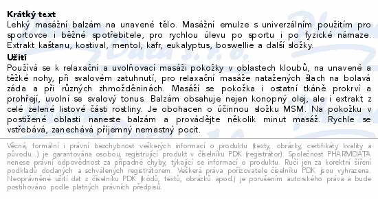 Lehký masážní balzám na unavené tělo. Masážní emulze s univerzálním použitím pro sportovce i běžné spotřebitele, pro rychlou úlevu po sportu i po fyzické námaze. Extrakt kaštanu, kostival, mentol, kafr, eukalyptus, boswellie a další složky.