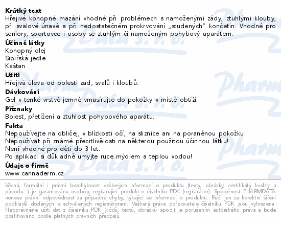 Cannaderm Thermolka je masážní hřejivé mazání, které se používá k úlevě při bolestech a ztuhlosti svalů, kloubů a zad. Jedná se o přípravek s obsahem konopného oleje a extraktů, který působí lokálně.
