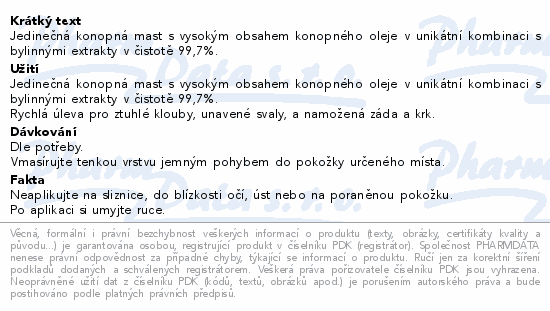 Jedinečná konopná mast s vysokým obsahem konopného oleje v unikátní kombinaci s bylinnými extrakty v čistotě 99,7%.