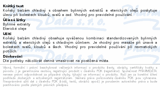 Koňský balzám chladivý s obsahem bylinných extraktů a eterických olejů poskytuje úlevu při bolestech kloubů, svalů a zad. Vhodný pro pravidelné používání.