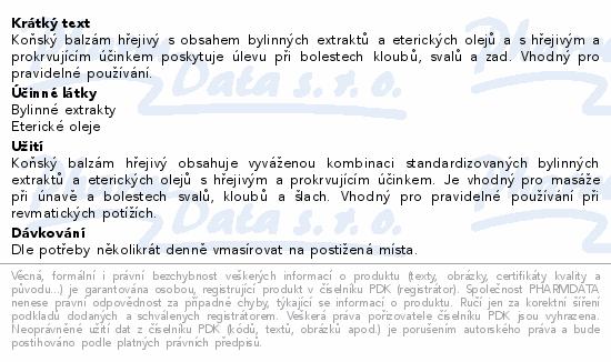 Koňský balzám hřejivý s obsahem bylinných extraktů a eterických olejů a s hřejivým a prokrvujícím účinkem poskytuje úlevu při bolestech kloubů, svalů a zad. Vhodný pro pravidelné používání.