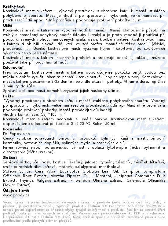 Kostivalová mast s kafrem - výborný prostředek s obsahem kafru k masáži ztuhlého pohybového aparátu. Mast je vhodná po sportovních výkonech, velké námaze, při prochlazení údů apod. Silně prohřívá a podporuje prokrvení pokožky. 50 ml.