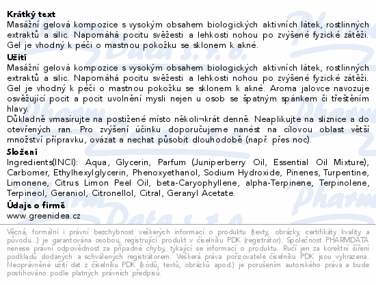 Masážní gelová kompozice s vysokým obsahem biologických aktivních látek, rostlinných extraktů a silic. Napomáhá pocitu svěžesti a lehkosti nohou po zvýšené fyzické zátěži. Gel je vhodný k péči o mastnou pokožku se sklonem k akné.