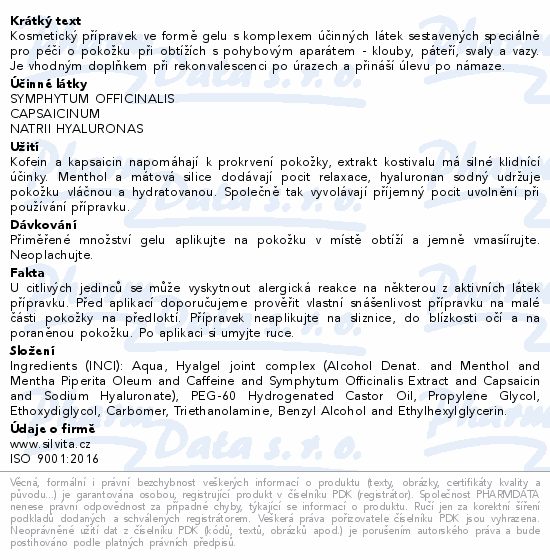 Kosmetický přípravek ve formě gelu s komplexem účinných látek sestavených speciálně pro péči o pokožku při obtížích s pohybovým aparátem - klouby, páteří, svaly a vazy. Je vhodným doplňkem při rekonvalescenci po úrazech a přináší úlevu po námaze.