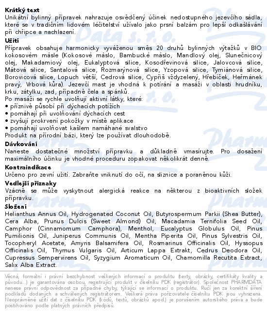 Unikátní bylinný přípravek nahrazuje osvědčený účinek nedostupného jezevčího sádla, které se v tradičním lidovém léčitelství užívalo jako prsní balzám pro lepší odkašlávání při chřipce a nachlazení.