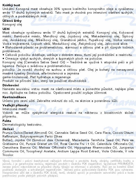 Unikátní Konopná mast obsahuje 30% vysoce kvalitního konopného oleje a vyváženou směs 17 druhů bylinných extraktů. Tato mast je vhodná pro intenzivní ošetření suchých, citlivých a podrážděných míst.