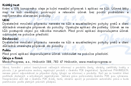 Krém s 10% konopného oleje je kožní masážní přípravek k aplikaci na kůži. Účinné látky mají na kůži osvěžující, prokrvující a relaxační účinek bez pocitů podráždění a nepříjemného zčervenání pokožky.