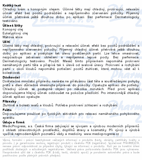 Chladivý krém s konopným olejem. Účinné látky mají chladivý, prokrvující, relaxační účinek efekt bez pocitů podráždění a nepříjemného zčervenání pokožky. Příjemný účinek přetrvává ještě dlouhou dobu po aplikaci. Bez parfemace. Dermatologicky testováno.