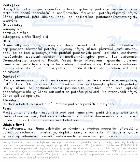 Hřejivý krém s konopným olejem.Účinné látky mají hřejivý, prokrvující, relaxační účinek efekt bez pocitů podráždění a nepříjemného zčervenání pokožky.Příjemný hřejivý účinek přetrvává ještě dlouhou dobu po aplikaci.Bez parfemace.Dermatologicky testováno.