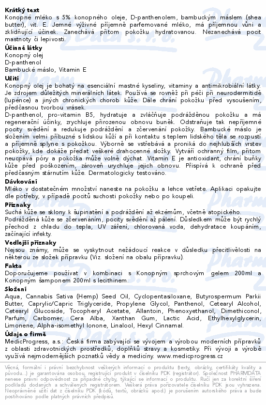 Konopné mléko s 5% konopného oleje, D-panthenolem, bambuckým máslem (shea butter), vit. E. Jemné výživné příjemně parfemované mléko, má příjemnou vůni a zklidňující účinek. Zanechává přitom pokožku hydratovanou. Nezanechává pocit mastnoty či lepivosti.