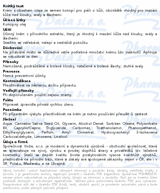 Krém s obsahem oleje ze semen konopí pro péči o kůži, obzvláště vhodný pro mazání kůže nad klouby, svaly a šlachami.