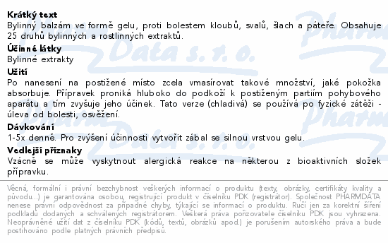Bylinný balzám ve formě gelu, proti bolestem kloubů, svalů, šlach a páteře. Obsahuje 25 druhů bylinných a rostlinných extraktů.