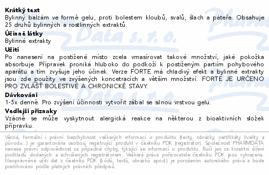 Bylinný balzám ve formě gelu, proti bolestem kloubů, svalů, šlach a páteře. Obsahuje 25 druhů bylinných a rostlinných extraktů.