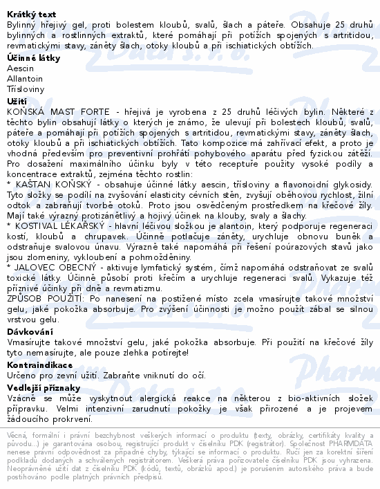 Bylinný hřejivý gel, proti bolestem kloubů, svalů, šlach a páteře. Obsahuje 25 druhů bylinných a rostlinných extraktů, které pomáhají při potížích spojených s artritidou, revmatickými stavy, záněty šlach, otoky kloubů a při ischiatických obtížích.