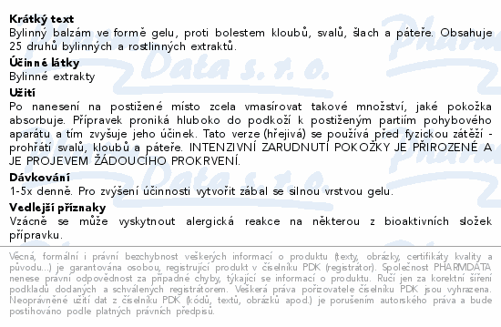Bylinný balzám ve formě gelu, proti bolestem kloubů, svalů, šlach a páteře. Obsahuje 25 druhů bylinných a rostlinných extraktů.