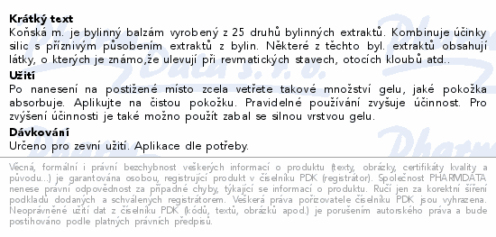 Koňská m. je bylinný balzám vyrobený z 25 druhů bylinných extraktů. Kombinuje účinky silic s příznivým působením extraktů z bylin. Některé z těchto byl. extraktů obsahují látky, o kterých je známo,že ulevují při revmatických stavech, otocích kloubů atd..