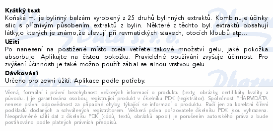 Koňská m. je bylinný balzám vyrobený z 25 druhů bylinných extraktů. Kombinuje účinky silic s příznivým působením extraktů z bylin. Některé z těchto byl. extraktů obsahují látky,o kterých je známo,že ulevují při revmatických stavech, otocích kloubů atp...