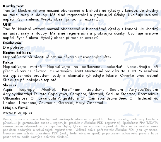 Tradiční kloubní kafrové mazání obohacené o blahodárné výtažky z konopí. Je vhodný na záda, svaly a klouby. Má silné regenerační a prokrvující účinky. Uvolňuje svalové napětí. Rychlá úleva. Vysoký obsah přírodních extraktů.