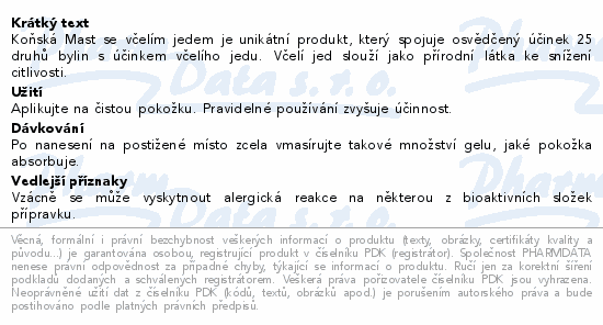 Koňská Mast se včelím jedem je unikátní produkt, který spojuje osvědčený účinek 25 druhů bylin s účinkem včelího jedu. Včelí jed slouží jako přírodní látka ke snížení citlivosti.
