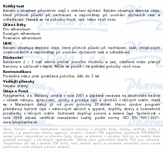 Balzám s obsahem přírodních olejů k ulehčení dýchání. Balzám obsahuje éterické oleje, které příznivě působí při nachlazení, kašli a napomáhají při uvolnění dýchacích cest a odkašlávání. Nanáší se na pokožku hrudi, zad, nebo okolí nosu.