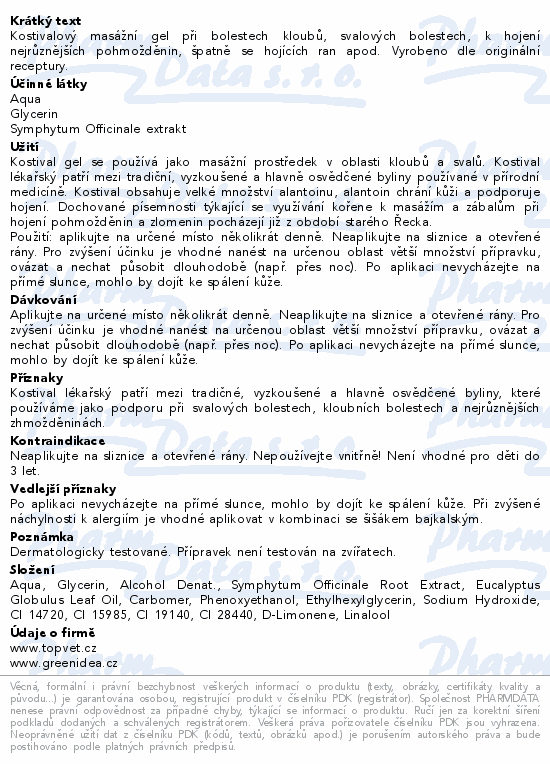 Kostivalový masážní gel při bolestech kloubů, svalových bolestech, k hojení nejrůznějších pohmožděnin, špatně se hojících ran apod. Vyrobeno dle originální receptury.