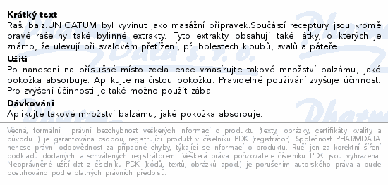Raš. balz.UNICATUM byl vyvinut jako masážní přípravek.Součástí receptury jsou kromě pravé rašeliny také bylinné extrakty. Tyto extrakty obsahují také látky, o kterých je známo, že ulevují při svalovém přetížení, při bolestech kloubů, svalů a páteře.