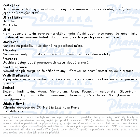 Hadí krém s chladivým účinkem, určený pro zmírnění bolestí kloubů, svalů, šlach a jejich poúrazových stavů.