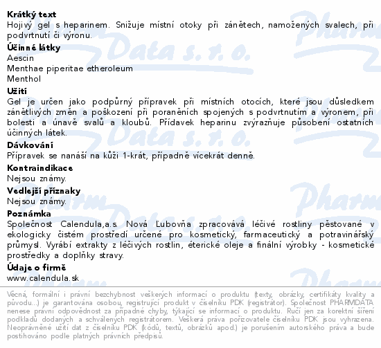 Hojivý gel s heparinem. Snižuje místní otoky při zánětech, namožených svalech, při podvrtnutí či výronu.