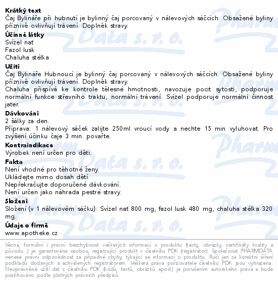 Čaj Bylináře při hubnutí je bylinný čaj porcovaný v nálevových sáčcích. Obsažené byliny příznivě ovlivňují trávení. Doplněk stravy.