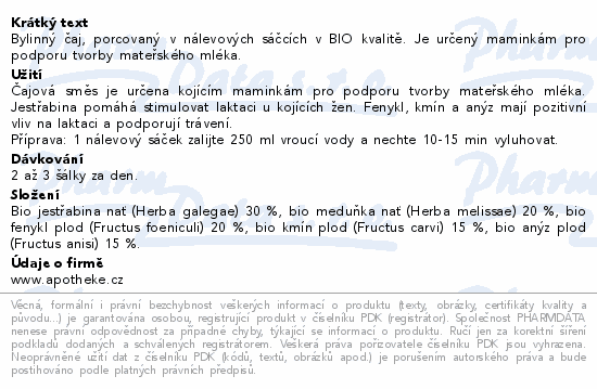 Bylinný čaj, porcovaný v nálevových sáčcích v BIO kvalitě. Je určený maminkám pro podporu tvorby mateřského mléka.