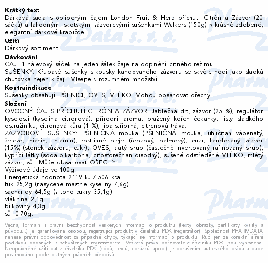 Dárková sada s oblíbeným čajem London Fruit & Herb příchuti Citrón a Zázvor (20 sáčků) a lahodnými skotskými zázvorovými sušenkami Walkers (150g) v krásně zdobené, elegantní dárkové krabičce.