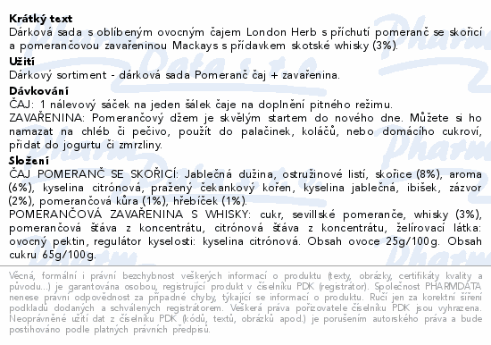 Dárková sada s oblíbeným ovocným čajem London Herb s příchutí pomeranč se skořicí a pomerančovou zavařeninou Mackays s přídavkem skotské whisky (3%).